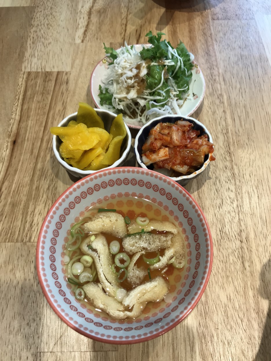 Salad, pickled radish, kimchi, and udon soup were served before the main food.